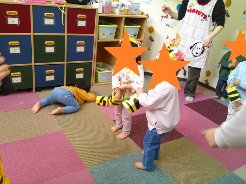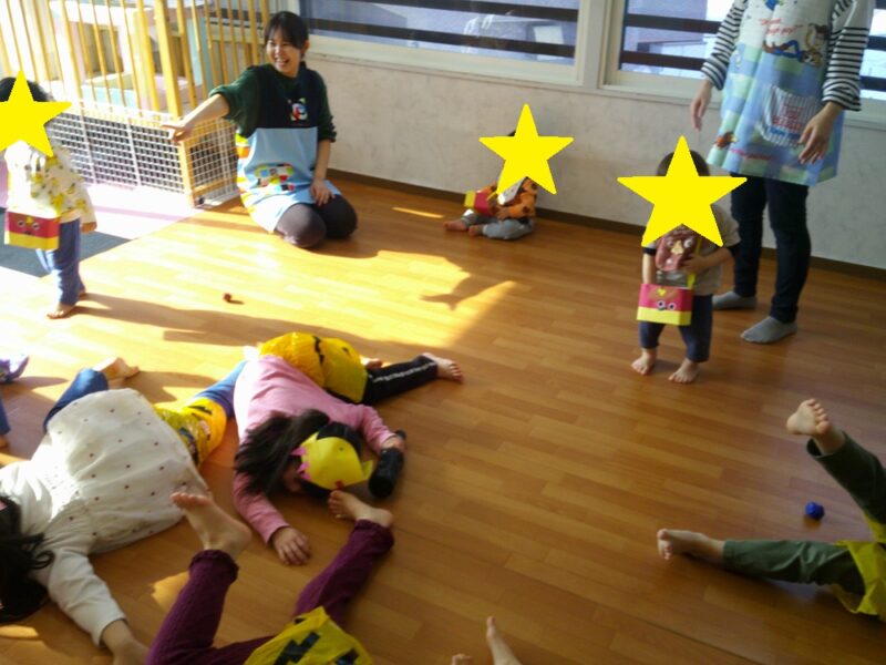 ほしさん、そらさんはひまわりさんが変身したちび鬼さんに豆ボールをたくさんまいて楽しく豆まきが