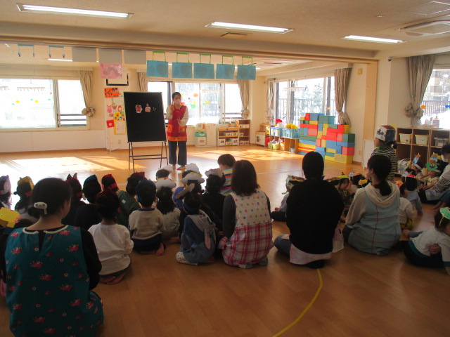 ホールでは、各クラスから代表のお友達に出てきてもらってお面と豆入れ発表をしましたよ(⌒∇⌒)