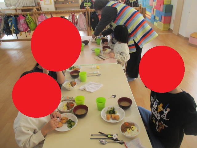 豆まきをとっても頑張って、お腹が空いた子どもたちは給食の鬼さん納豆ごはんをモリモリ
