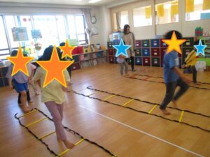 体操教室では、ラダーを使ったアップから始まり鬼ごっこなどで遊びました!